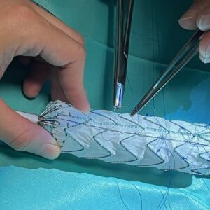 In questo primo caso, la procedura ha previsto prima la costruzione su banco della PMEG partendo da una endoprotesi standard tubulare di calibro 26mm. Il progetto della PMEG è stato eseguito utilizzando un modello TAC guidato. Una volta modificata l’endoprotesi è stata impiantata nel modello aptico mediante tecnica endovascolare utilizzando la sala operatoria di Niguarda dove è stato possibile procedere al rilascio ed alla cannulazione dei vasi celiaco, mesenterici e renali. La simulazione della PMEG è stata completata in circa 3.5 ore dall’inizio della progettazione del modello PMEG fino alla cannulazione dei vasi. La tempistica è stata monitorata anche per rendere il modello riproducibile in emergenza e creare pertanto un processo decisionale cronologicamente efficace sia in elezione che in urgenza.