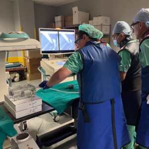 Alla procedura PMEG erano presenti gli sviluppatori del simulatore aptico di PRINTMED 3D, Maurizio Vertemati (responsabile Realtà Virtuale e ricostruzione 3D) e Francesco Cavaliere (coordinatore Stampa 3D-Officina Meccanica Dipartimento Fisica).